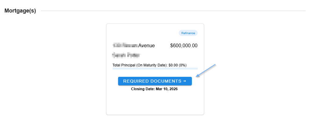2) In the applicant portal, Miranda would see any applications she hasn't yet submitted under "In Progress Application(s)", and any submitted applications under "Mortgages". On the deal where we requested documents, Miranda can now click on "Required Documents".